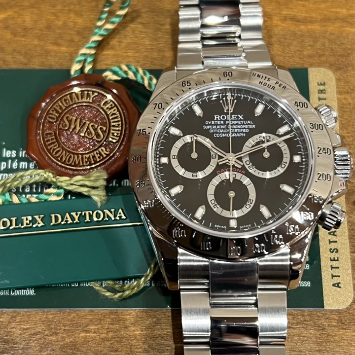 ・現行モデルとは異なる、メタリックな輝きが特徴的なステンレスベゼルを備えたRef.116520。