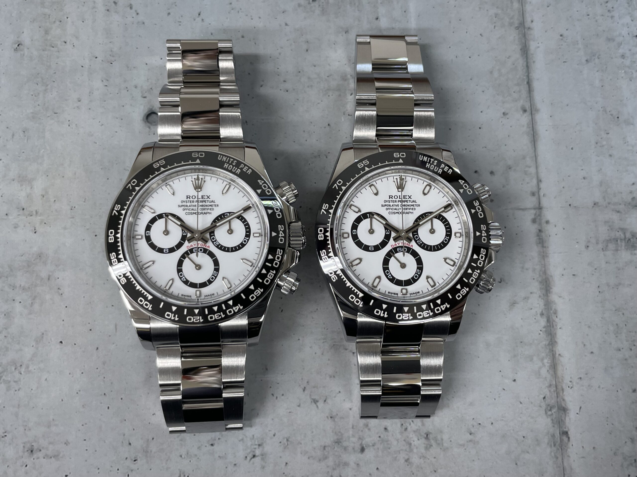 | 左の画像がRef.126500LN。 右がRef.116500LNです。Ref.126500LNはセラミックベゼルの外周にステンレスの縁取りが施され、横三つ目のサブカウンターはRef.116500LNと比較すると細い仕上がりに。時間を示すインデックス部分も細身になっております。ラグの形状は無垢素材のデイトナと統一された、切り立ったシェイプとなっております。