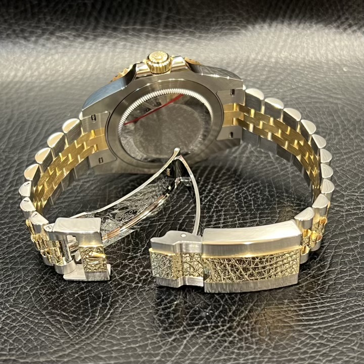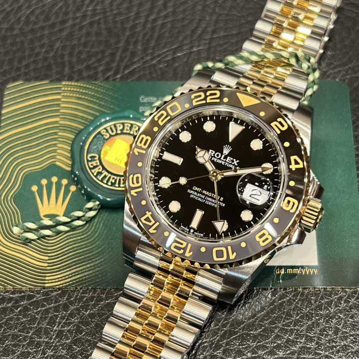 ・シックな配色の灰/黒ベゼルにイエローゴールドが華やかに映えるラグジュアリーな1本。