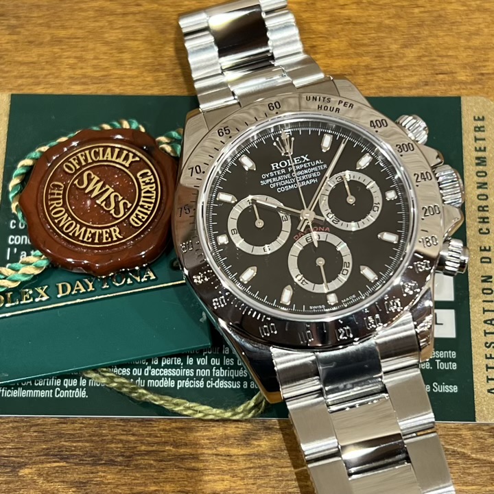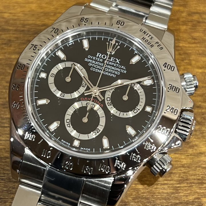 ・現行モデルとは異なるステンレスベゼルが搭載され、メタリックな輝きが魅力的なRef.116520。