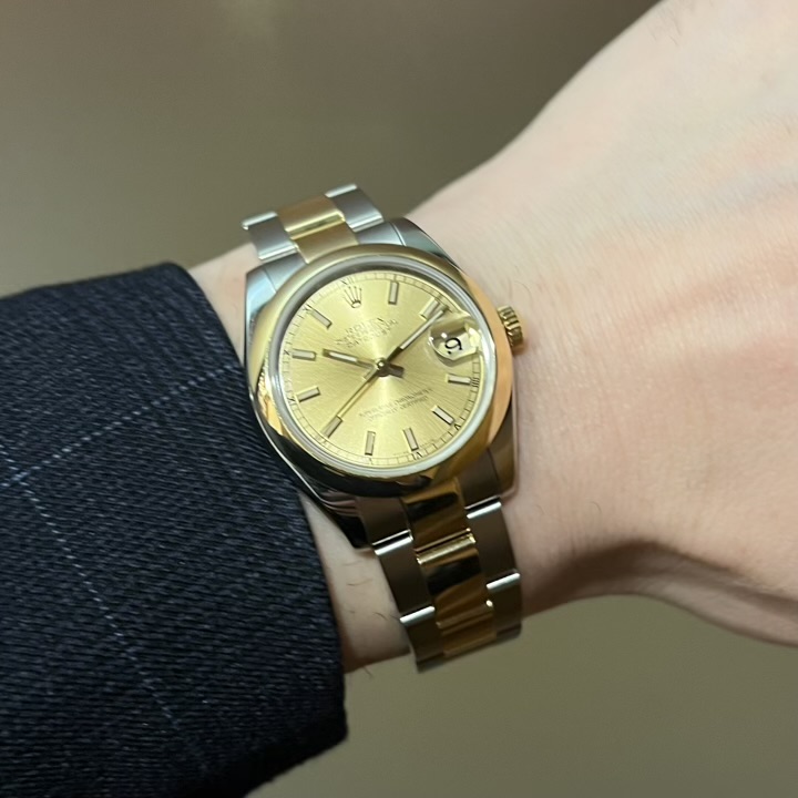 ・ポリッシュベゼル×オイスターブレスレットの組み合わせは、シンプルでスッキリとしたデザインです。
