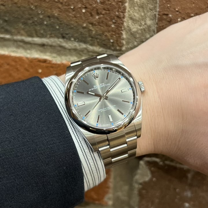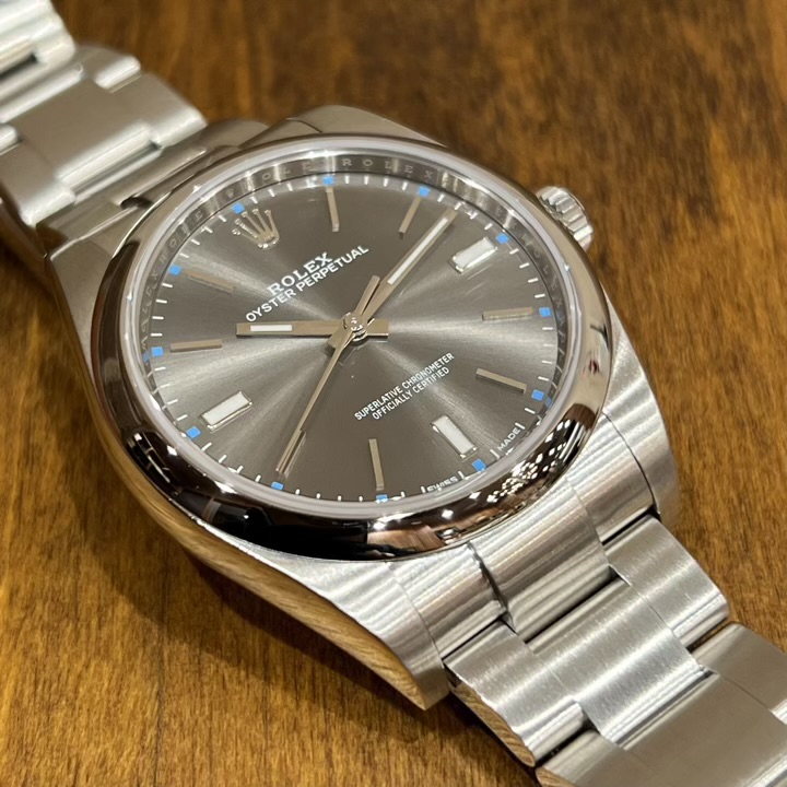 ・落ち着いた色合いのダークロジウムダイヤルにインデックスの水色が差し色となりお洒落です。