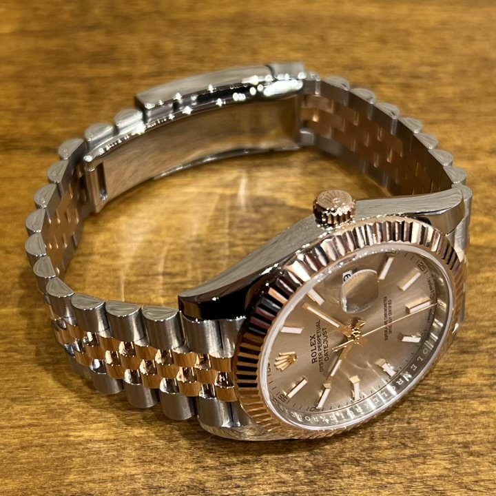 ・エバーローズゴールドの輝きとも相まって、上品な雰囲気を腕元に与えてくれる一本でございます。