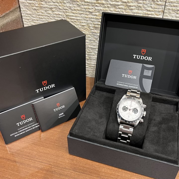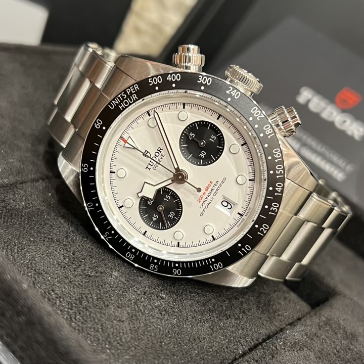 ・爽やかなカラーリングが高い人気を集める、ブラックベイクロノのホワイトダイヤル。